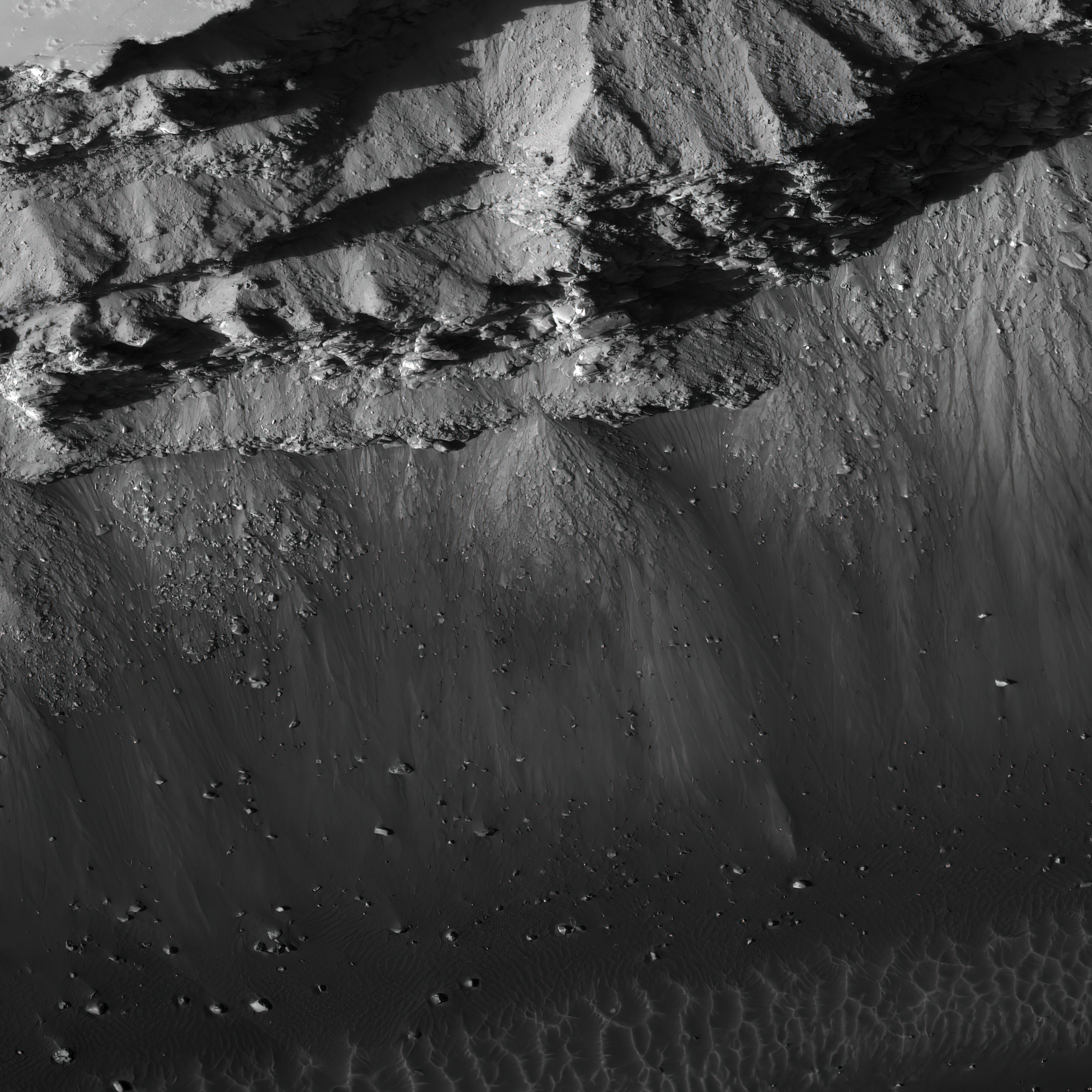 The fossae have long been proposed to be very tectonically active. Our goal is to look for new rockfalls that might indicate current seismic shaking.A note: Mars does not have tectonic plates, but the activity is mostly due to the pressure of the material that can cause a shifting of the terrain.Image is less than 5 km (3 mi) across and is 277 km (172 mi) above the surface.